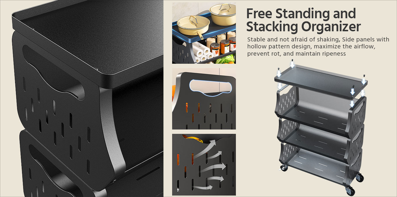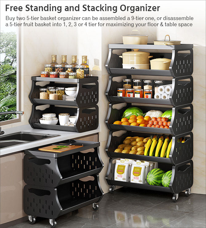 - Free Standing and Stacking Organizer:Vegetable fruit basket you can assemble it as you wanted. Buy two 5-tier basket organizer can be assembled a 9-tier one, or disassemble a 5-tier fruit basket into 1, 2, 3 or 4 tier for maximizing your floor & table space. Comes with mounting hardware and instructions. No hassle setup!