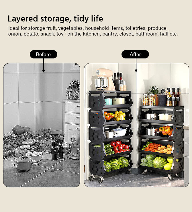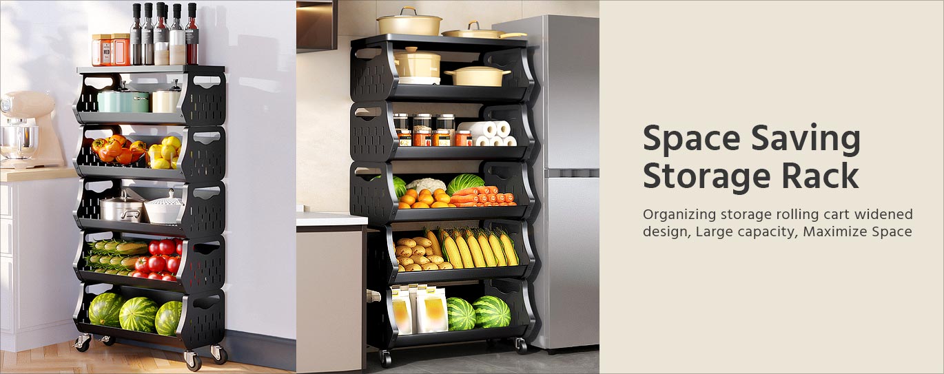 - Space Saving Storage Rack:Organizing storage rolling cart widened design, Large capacity, Maximize Space. You can use 5 storage racks separately, to save your valuable countertop space. Or as a complete 5 tiers set for a space saver storage, or fruit and vegetable basket with a minimum footprint.