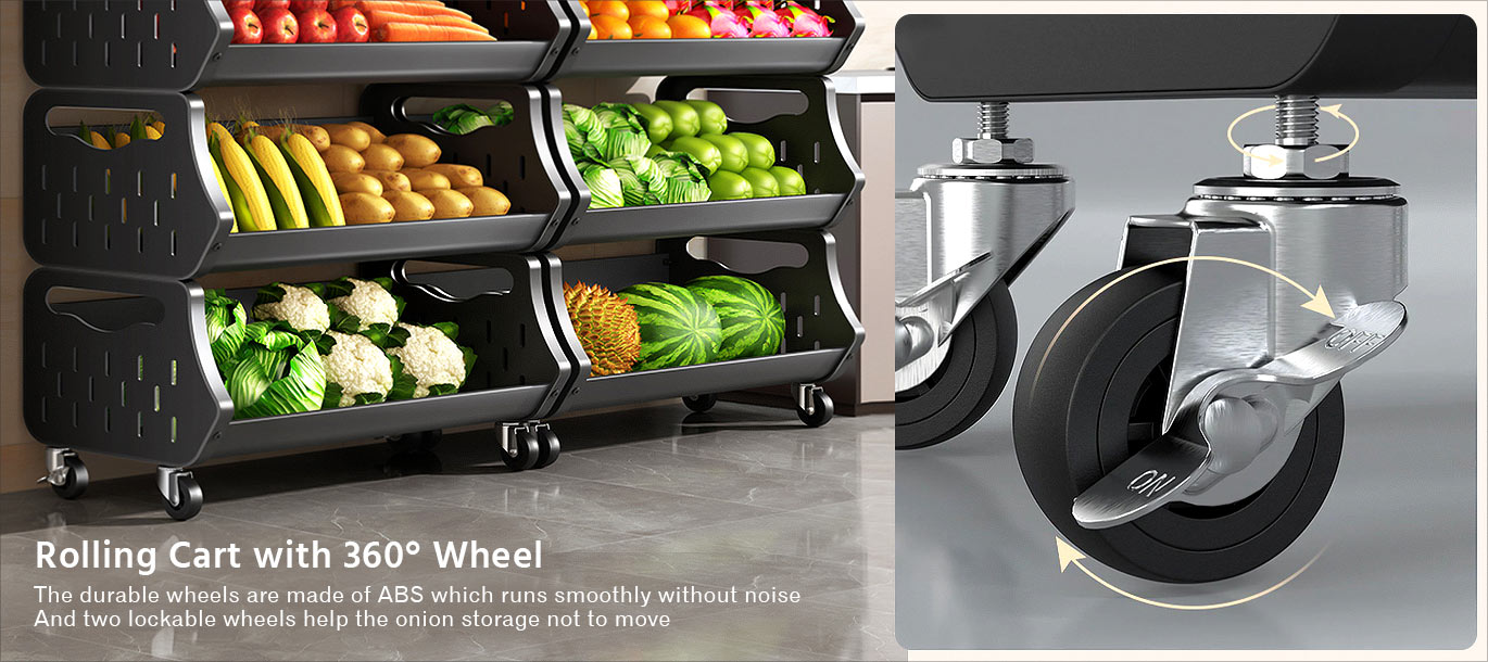 - Rolling Cart with 360° Wheel:Removable metal wire baskets, The durable wheels are made of ABS which runs smoothly without noise. Fruit storage basket with 4 pcs universal wheels, help you move it to everywhere you wanted. And two lockable wheels help the onion storage not to move.