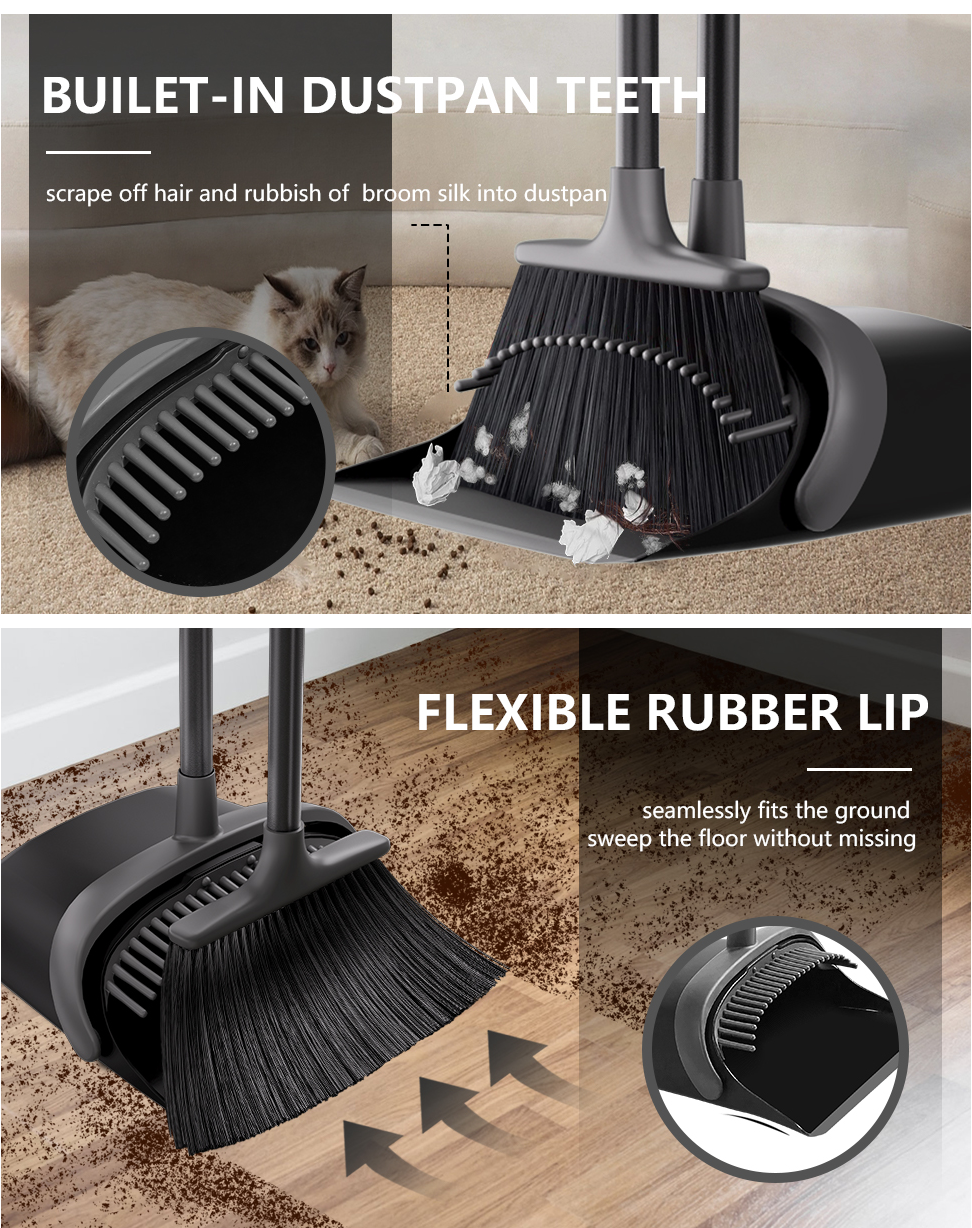 - Comb Design Dustpan: The broom with dustpan combo set has a comb tooth design, which is convenient to scrape the hair and debris on the broom into the standing dust pan and broom combo, no need to drag by hand, easy to clean human hair/pet hair and dust on the broom.