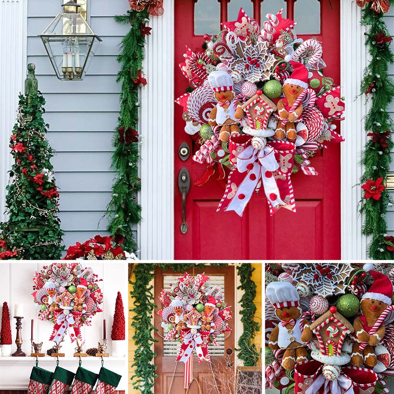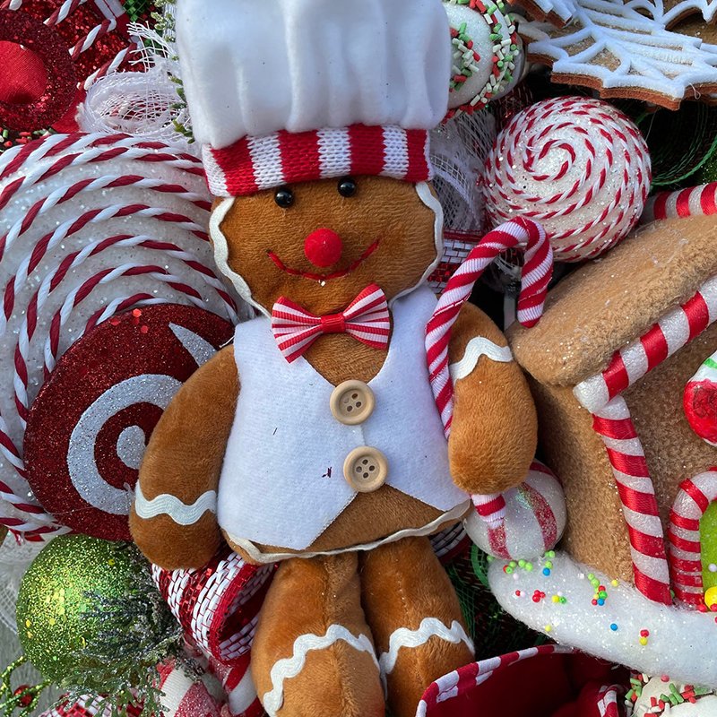 🎅Materials: Evergreen Base, Glitter Picks, Mesh, Designer Wired Ribbon, Christmas Ornaments, Plush Gingerbread Dolls