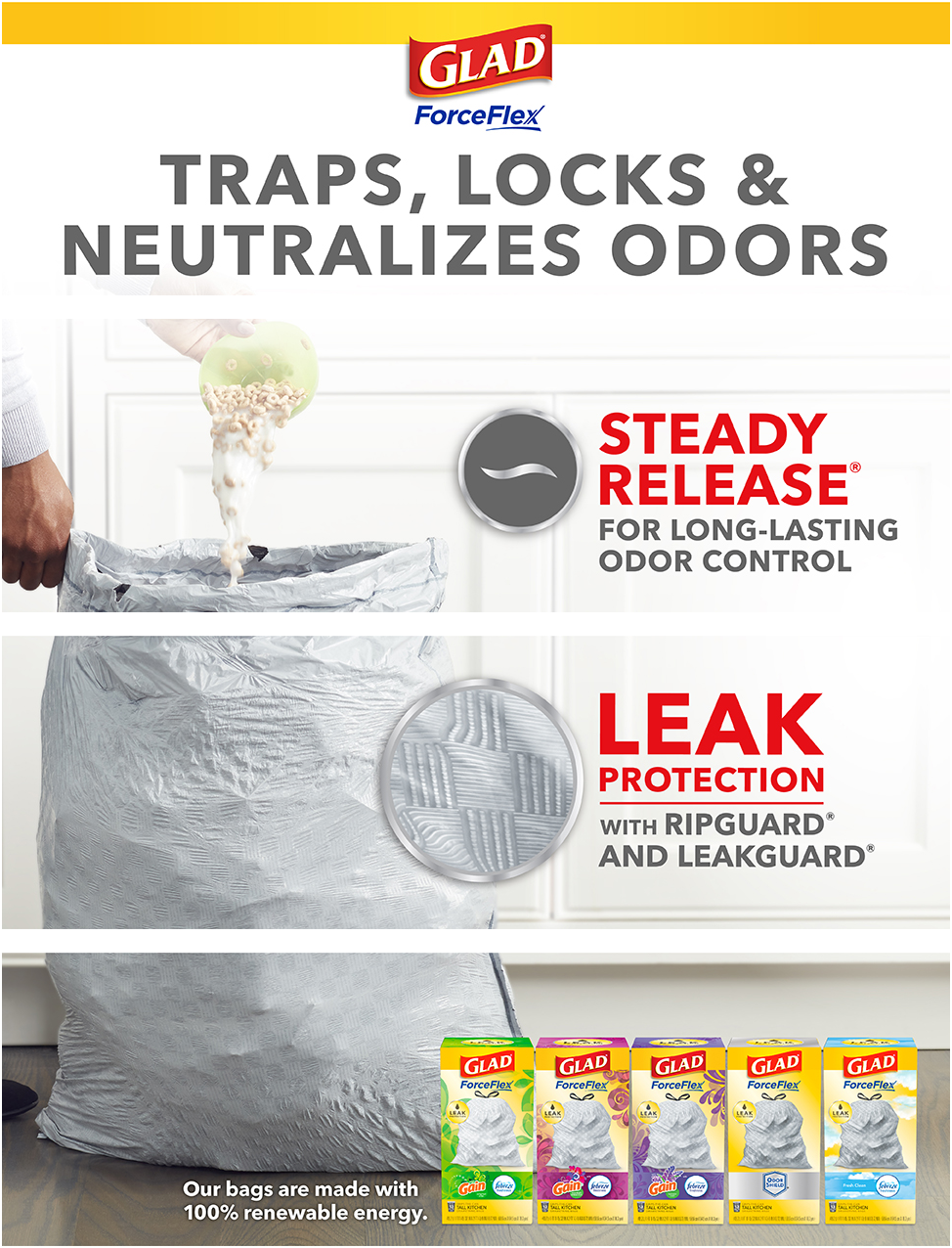 - Leak protection: ForceFlex technology with Dual-layer leak protection flexes and expands around sharp Edges and heavy trash without tearing