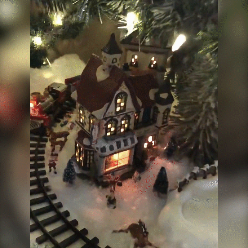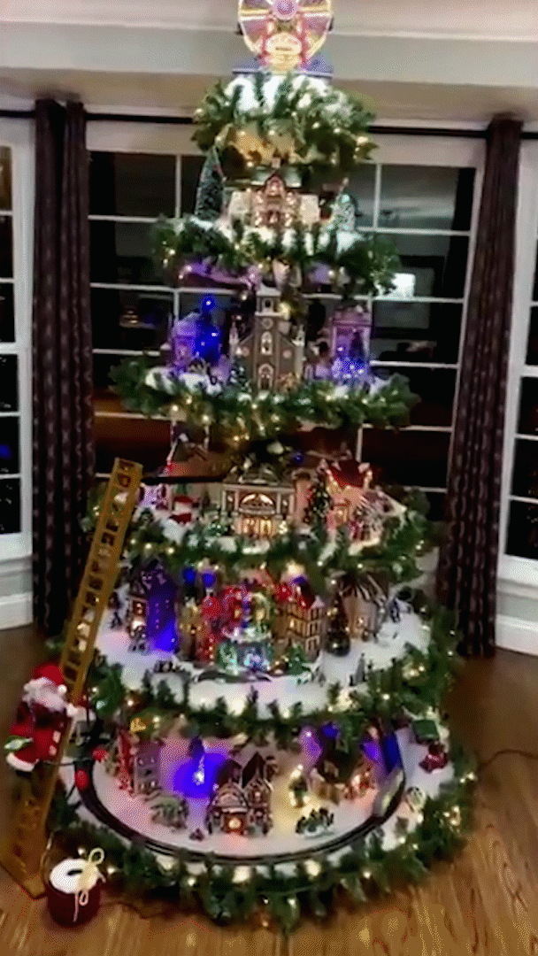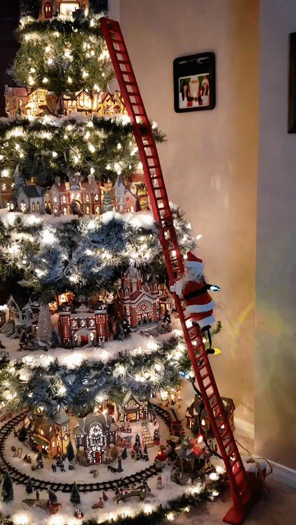 A Christmas Tree Village combo instead of a regular tree complete with a Train, a Ferris Wheel, Illuminated houses and Santa Claus climbing on a ladder